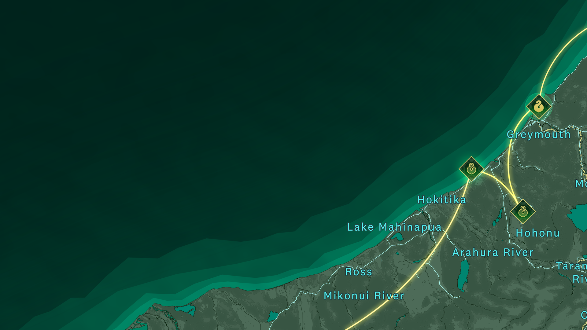 Explore the map to visit distinct locations along our Pounamu Pathway, carved through the rugged landscape of the West Coast/Te Tai o Poutini.