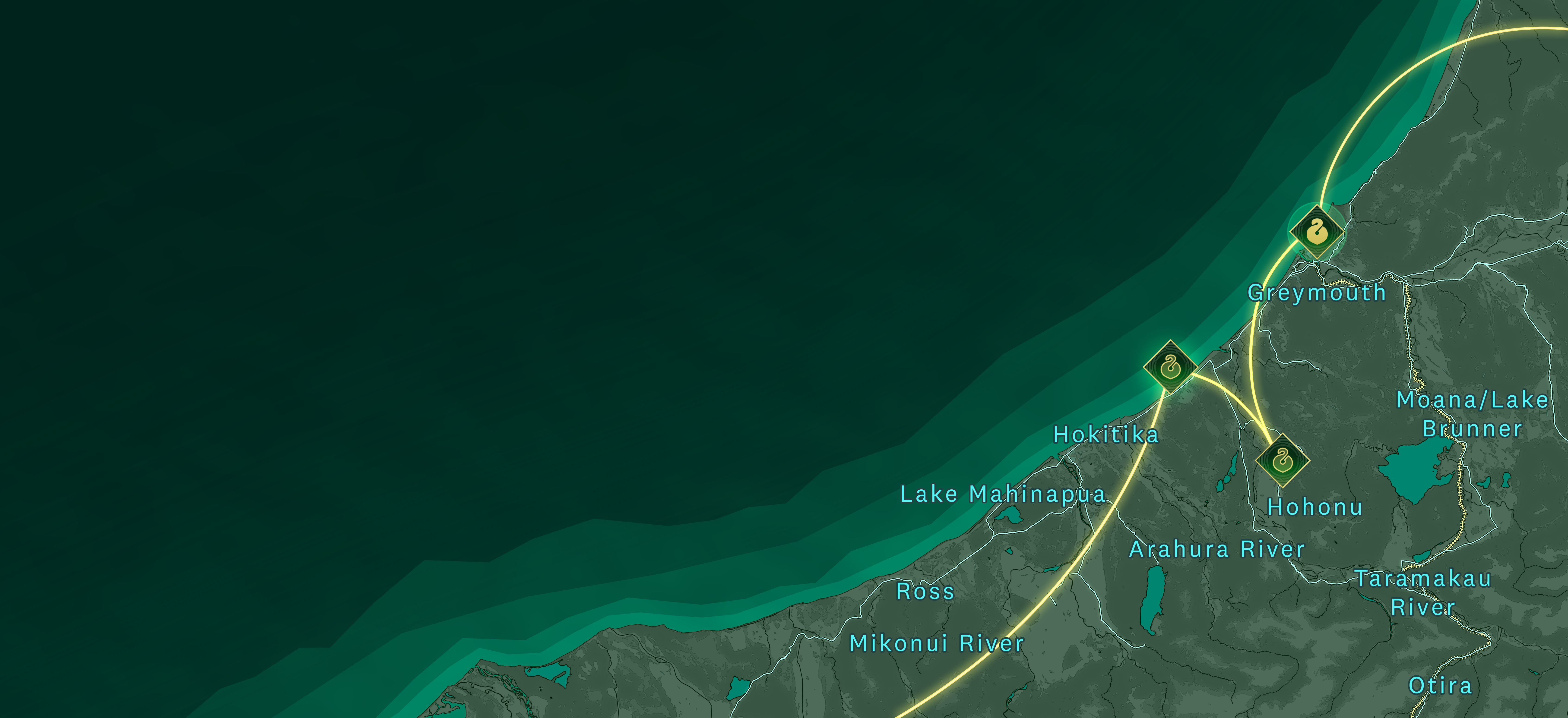 Explore the map to visit distinct locations along our Pounamu Pathway, carved through the rugged landscape of the West Coast/Te Tai o Poutini.